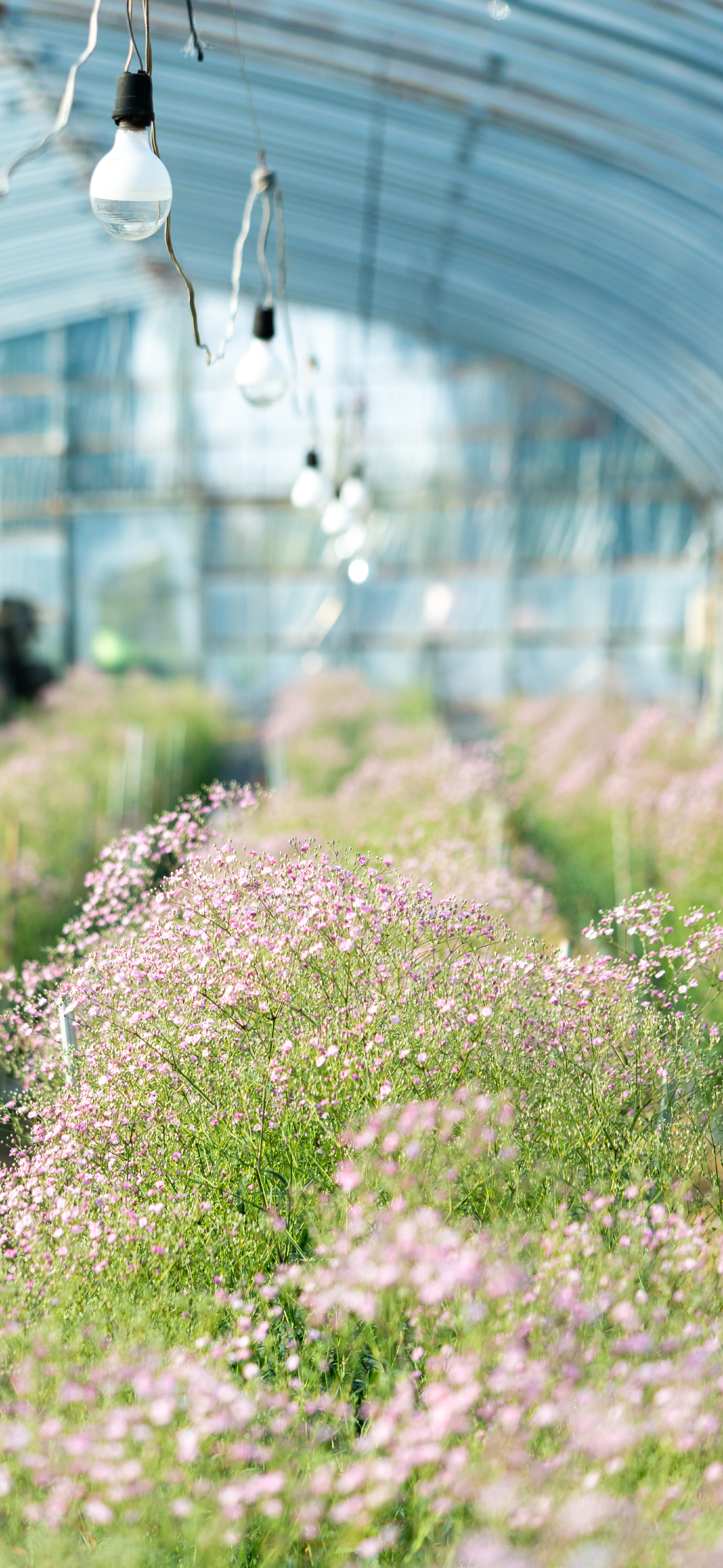 SAKURA FES NIHONBASHI 2024のメイン花材のピンクのかすみ草だけでなく、生産量日本一のスターチスやスイートピー、ガーベラなどを生産しています。